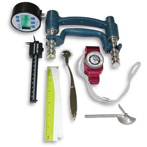 #7-Piece Hand Evaluation Sets - 300 lbs (136 kg) Digital Gauge Dynamometer, 60 lbs (27 kg) Pinch Gauge All instruments needed for a full hand evaluation. Grip strength is measured by the hydraulic hand dynamometer and pinch strength by the mechanical pinch gauge. Other instruments included are stainless steel goniometer, 2-point discriminator with 3rd point, Wartenburg pinwheel, finger circumference gauge and functional finger motion gauge. Sets available with dial or digital gauge dynamometers.One year warranty.Carrying case included. Product photo may not exactly match the product offered for sale. Please refer to the product description.