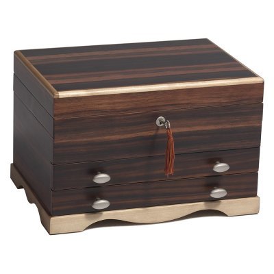 #The Adalyn Ebony and Maple Jewelry Box with Message Plate is beautifully crafted with okume wood, maple edges, and soft brushed nickel hardware, along with an elegant nickel plate, 2.5 by 1.75 inches, that's engravable. This compact box provides a perfect home for necklaces, earrings, rings, and bracelets. Sliding panels and smooth opening drawers offer necklace bars, ring bars, and generous compartments cloaked in suede. The velvety lining protects your jewels from scratching when properly stored. Plus, it prevents tarnishing that happens over time, so your bling will continue to dazzle. About JewelkeepersJewelkeepers was founded on the desire to provide a discriminating clientele the best possible jewelry boxes available on the market. They use quality woods and veneers to create jewelry boxes and chests that have beauty and character, along with design styles that complement individual lifestyles and their needs.